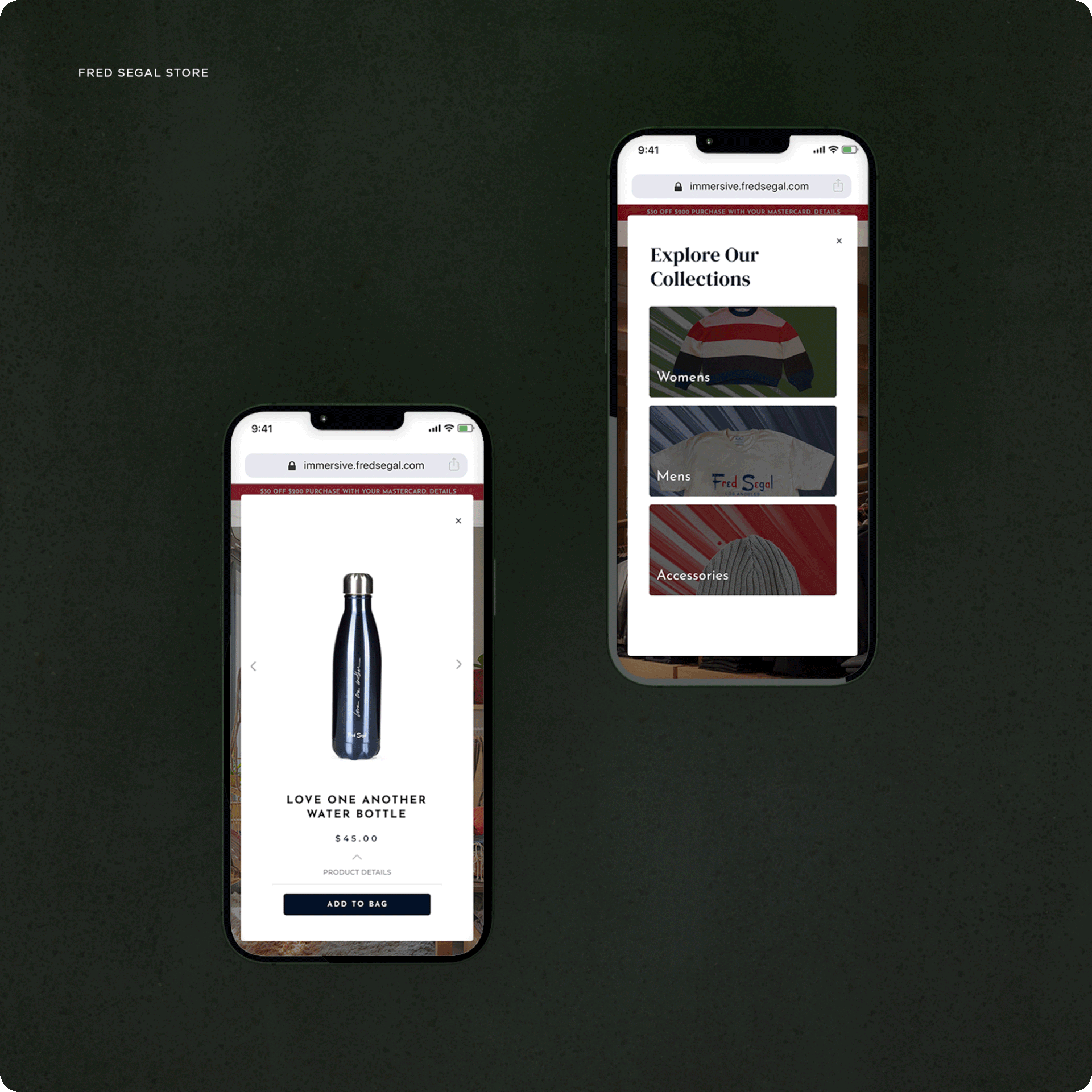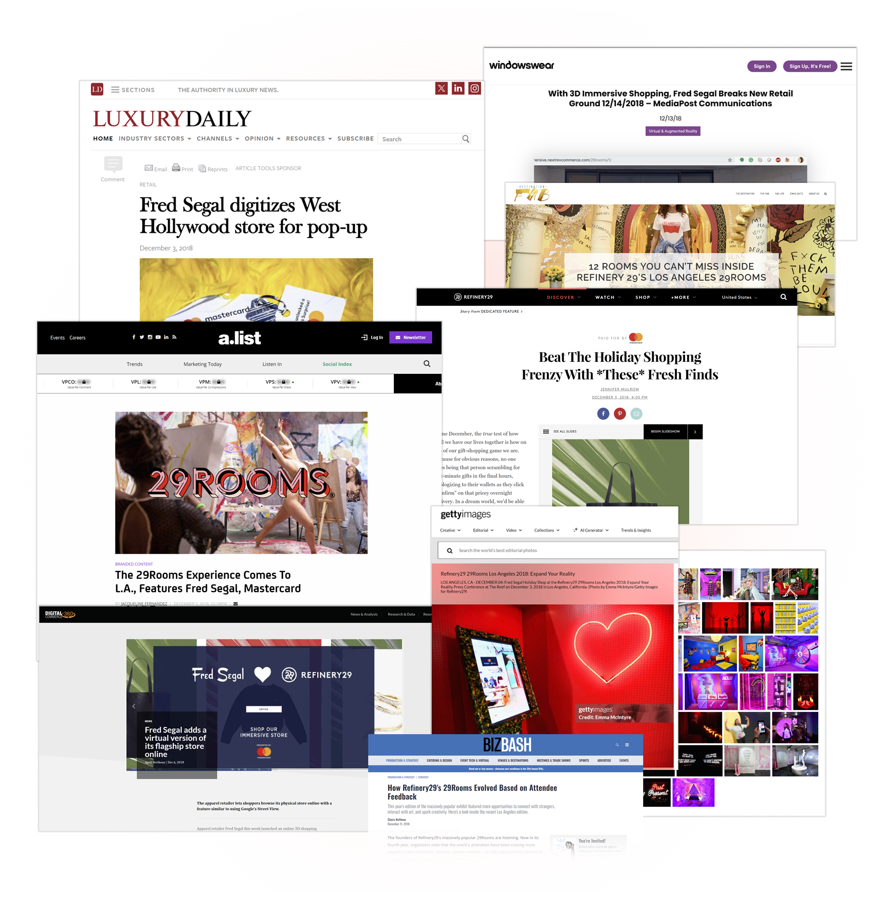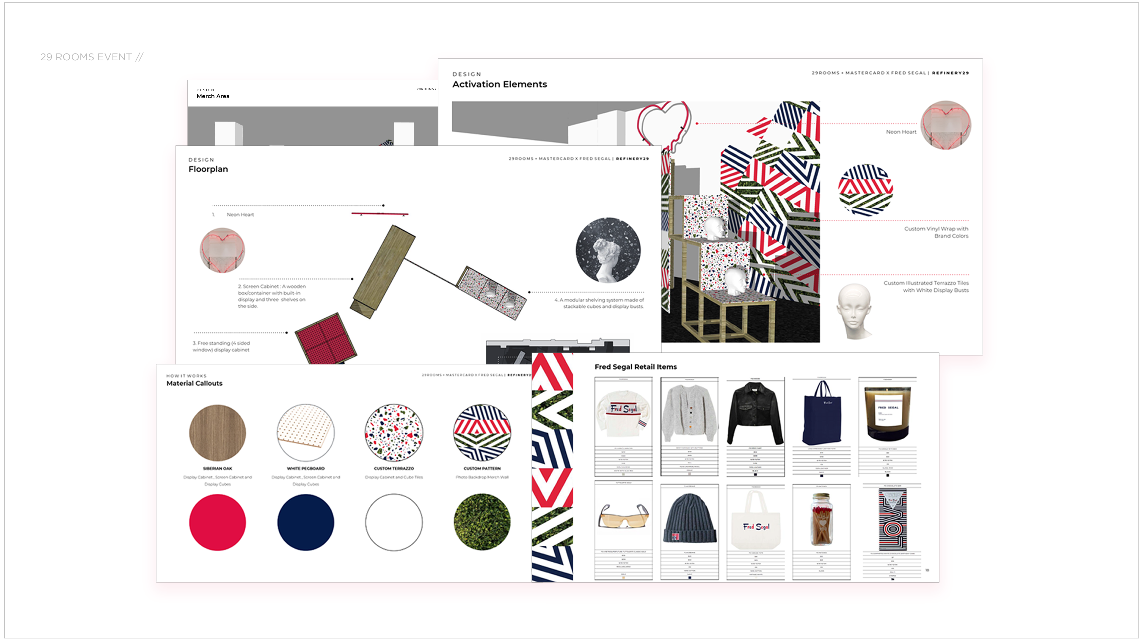 The 29Rooms Event: We debuted the Fred Segal immersive experience in collaboration with Refinery29 at the 29Rooms event, a once a year event hosted by Refinery29. It's filled with rooms of stimulating art installations and immersive visual and auditory experiences. Our teams built a brief with production parameters, materials, & floor plan. Shoppers navigated and shopped the Fred Segal + Refinery29 experience through a large kiosk and we even developed a QR code to allow users to open the experience right from their phones.