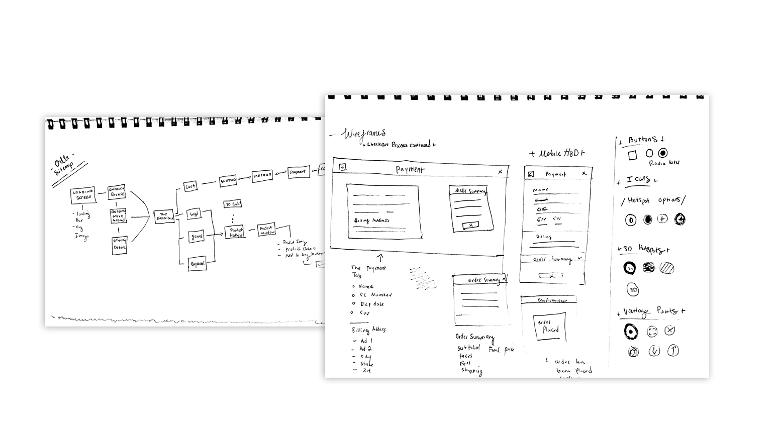 Putting pen to paper and using the research and insights we gathered, I initially began exploring concepts visually through low-fidelity wire frames, keeping in mind common translation design patterns. At this stage, we placed extra emphasis on ensuring component flexibility as our goal was to build a base template that could be easily customized for each retailer at later stages. So icons, pop-up modules, hotspots, navigation, and vantage points were the first to be sketched.